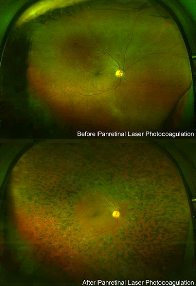 This treatment requires many laser applications, and thus may be divided into two or more separate sessions. Treatment stops the formation of new abnormal blood vessels and in most cases causes existing ones to shrink. Side effects include some loss of peripheral and color vision and a decrease in night vision. Some patients experience blurry vision, which can be temporary or continue indefinitely.